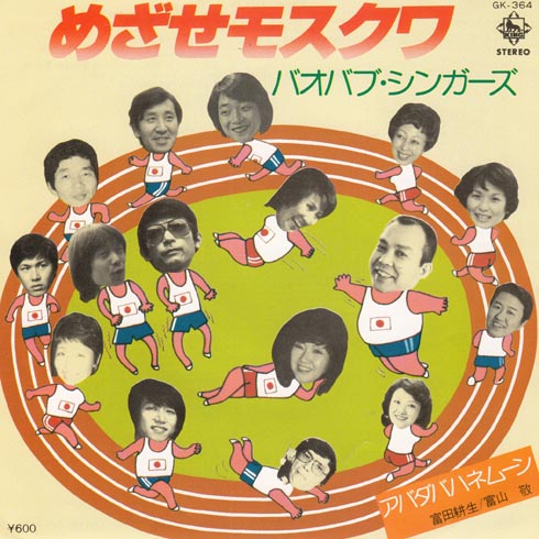 バオバブシンガーズは声優さんたちの事務所。その子みなさんでうたをうたったって感じ。もともとはジンギスカンというグループのモスクワオリンピックへの曲。日本でもはやったと思います。歌詞はまぁまぁモスクワのことを歌ってて、モスクワモスクワっていうさびは一緒。ところどころに「ヤマト発進!」とかご自身が担当していたキャラを紹介しています。野沢さんは星野鉄郎とかゲゲゲの鬼太郎って言ってました。まだ「おら悟空」って言ってなかったなぁ。あはは。ジャケットの誰が誰だかは不明。