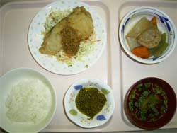 はん、ホッケムニエル、かぼちゃソテー、大根煮、きゅうりもみ。