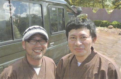 めずらしい藤やんとミスターの2ショット。反体制のお二人ですね。ミスターの頭の上に載っているのは、タンザニアの路上で子供たちが売っていたカメレオンのレオンちゃん(正式にはレオン1世です)。レオン1世のフィギュアはまだかなぁ。