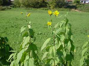 最近になって良く道路の脇に咲く背の高い黄色い花を見かけます。これは「キクイモ」という花で、原産地は北アメリカ、名前の通り根にイモ(塊茎)がつくのだそうです。家畜の飼料として栽培されたものが増えたのだそうです。(ももっち)