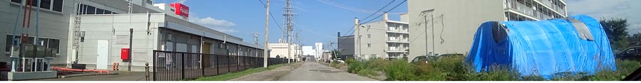 | 常磐通り、美園簡易郵便局前。進行方向奥は北光小学校。写真右が南岸通り・無加川・北見市民会館側。 |