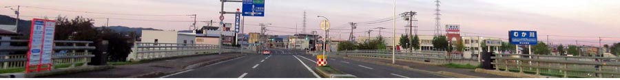 | とん田通り、早朝の無加川橋。前方は錦町の南岸通り交差点、進行方向奥が北光神社、写真左が無加川の下流方向。 |