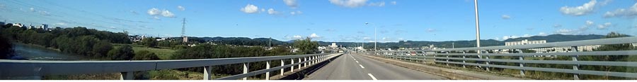 | 川東の道路から常呂川に架かる北見大橋。橋を渡ると南大通り、斜め右奥は小泉の市営団地。正面奥が北見工業大学。 |