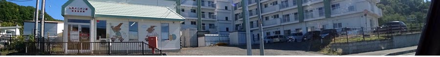 | 川東の南岸通り沿いにある北見オニオン簡易郵便局。奥の建物は老人ホーム。写真右が若松通り側。 |