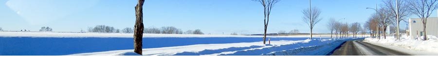 | 1月26日朝、中央三輪の南大通り。写真左が無加川の左岸堤防と三輪河川敷運動場、写真奥が西8号線、写真右奥に三輪小学校。 |