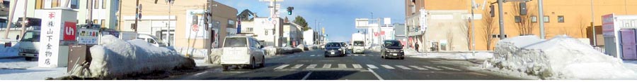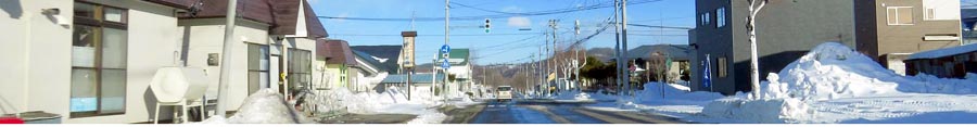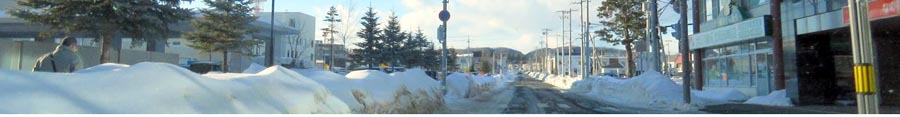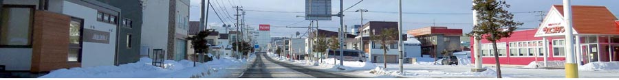 | 2月6日午後、錦町の南岸通りを野付牛自動車学校側から常磐通り方向。前方の交差点を右折すると北光幼稚園。 |