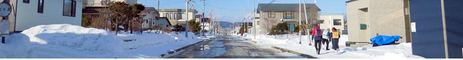 | 2月4日午後、無加川町の西5号線を北光通り側から南岸通り方向。左は北光通りバス停。 |
