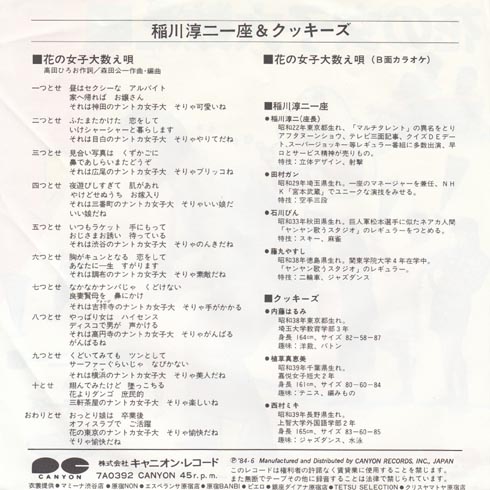 全く売れてなかったようです。1984年ころはテレビで熱湯のお風呂に入れられていたような感じがします。怖い話をするのはずっと後です。まぁ歌詞がね、女子大をちゃかしてますから、今では発売はできないでしょうなぁ。放送できるんかな?一座のみなさんは芸人さんで、石川びんさんは稲川さんの怖い話のプロデューサーらしいです。女子3人はただの元女子大生かなぁ?