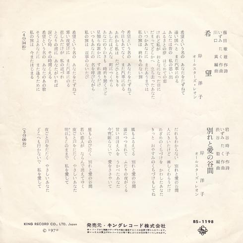 もともとはフォー・セインツっていうフォークグループの曲で、小さな日記とかが売れたんだそうな。そのフォー・セインツのドラマーが荒木しげるさんで、仮面ライダーストロンガーだった。知らなかったぁ。特捜最前線にも出てたなぁ。もうお亡くなりになっていた。残念ですね。希望は岸洋子さんの代表曲ですね。希望という名の あなたをたずねて遠い国へと また汽車にのる、っていいですねぇ。汽車っていうのがいいねぇ。1971年春の第43回選抜高校野球では、入場行進曲になったそうな。いい曲ですね。