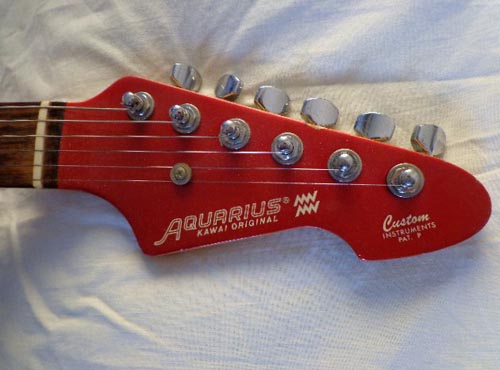 | ヘッドにはカワイオリジナルと書いてあります。確かにオリジナルシェイプだとは思いますが、いまいち感は否めない。80年代のギターですから時代はコンコルドヘッドのロック式アームですからね。 |