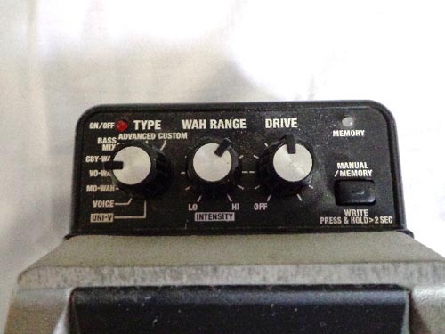 | つまみは3つ。左のつまみが曲者。書いてあるのはワウの種類で、CUSTOM 、ADVANCED、 BASSMIX、 CBY-WAH、 VO-WAH、 MO-WAH、 VOICE UNI-Vとなっている。CRYはもちろんCRYBABYですわ。つまりモデリングしてるんですね。 |