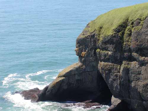 昔、厚岸の若者と霧多布の娘が恋に落ち、ある嵐の日若者が船で厚岸から霧多布へ向かう時、ここまで来て座礁し、そのまま海の底に消えてしまいました。それを知った娘はこの断崖立って泣きながらその若者の名を呼び続けていた、という言い伝えがあります。わかるでしょうか、写真中央の断崖に刻まれた乙女の横顔が。(14年8月27日:散布地区)