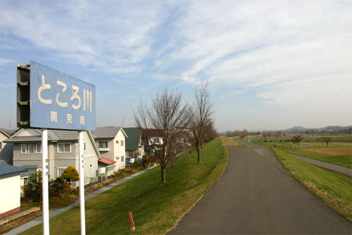 常呂川左岸堤防から、のつけ乃湯横の小石川沿い通りへ