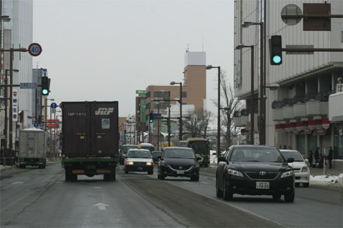 午前9時40分、常盤通り、常盤橋から北見市民会館方向