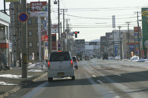 とん田通り、南大通り交差点側から北見中央病院方向