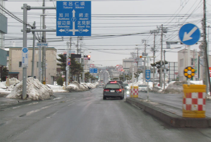 末広町の南岸通り、西4号線バス停前から野付牛自動車学校方向