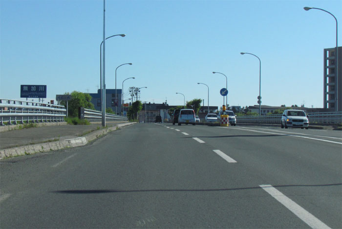写真中央、堤防の上に見える信号は工業技術センター前の南大通り交差点