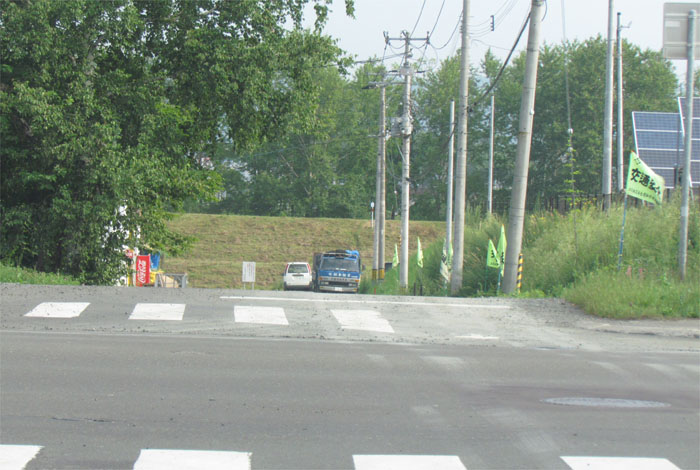 交差点から奥が無加川の右岸堤防で、写真奥が国道39号方向