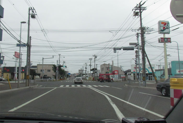 南岸通り、野付牛自動車学校前、奥がとん田通りの交差点