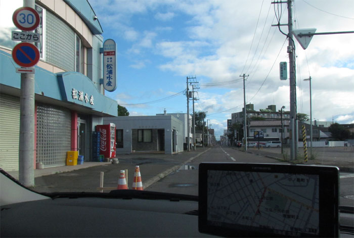 南岸通り、野付牛自動車学校前、奥がとん田通りの交差点