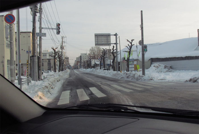 南岸通り、野付牛自動車学校前、奥がとん田通りの交差点