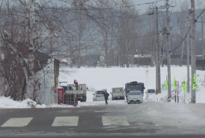 南岸通り、野付牛自動車学校前、奥がとん田通りの交差点
