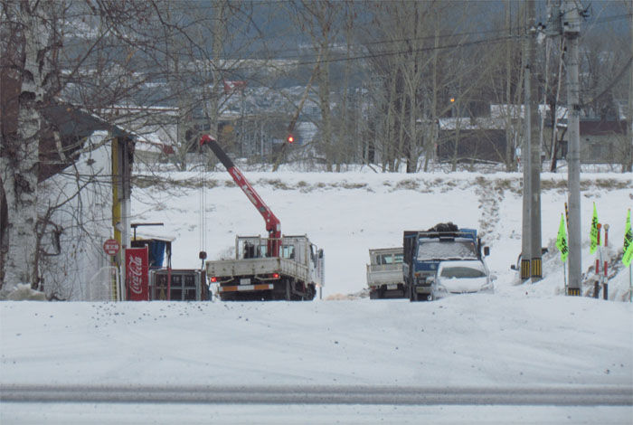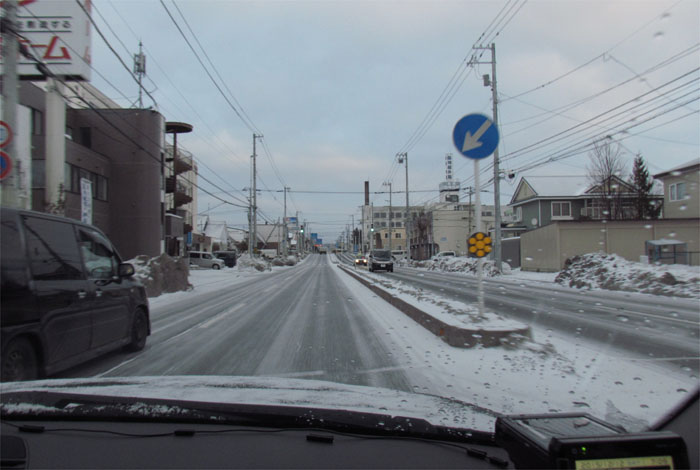 南岸通り、野付牛自動車学校前、奥がとん田通りの交差点