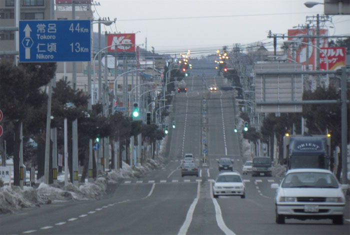 南岸通り、野付牛自動車学校前、奥がとん田通りの交差点