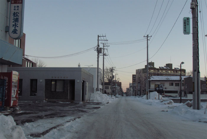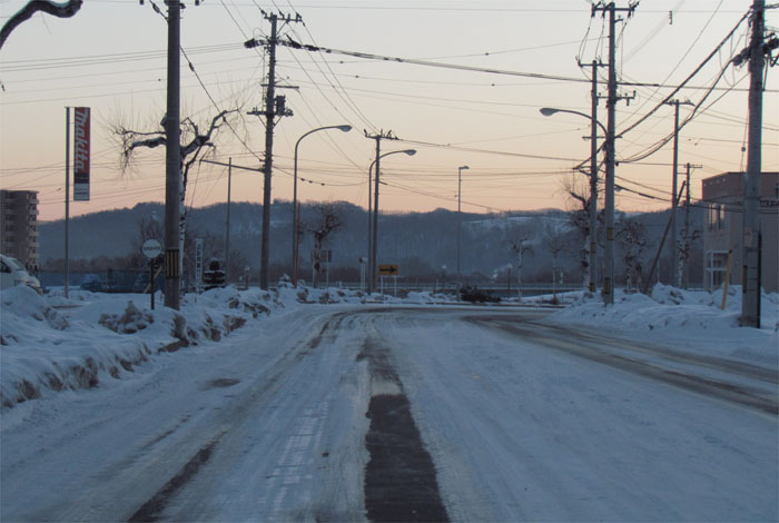 南岸通り、野付牛自動車学校前、奥がとん田通りの交差点
