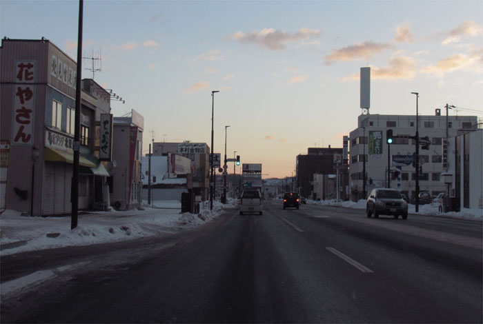 南岸通り、野付牛自動車学校前、奥がとん田通りの交差点