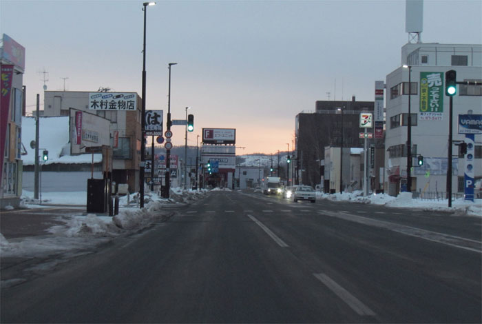 南岸通り、野付牛自動車学校前、奥がとん田通りの交差点