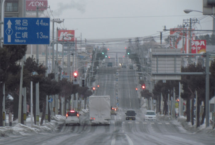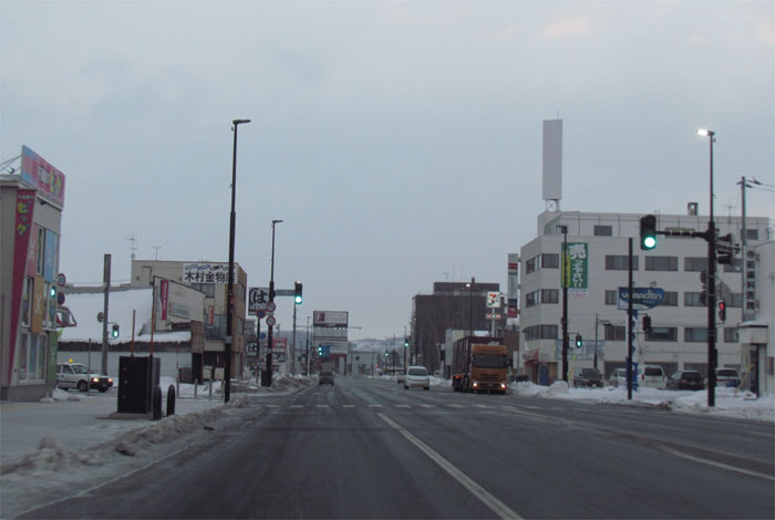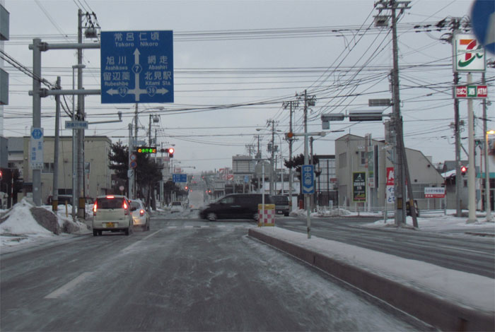 南岸通り、野付牛自動車学校前、奥がとん田通りの交差点