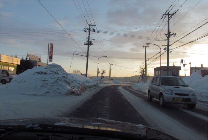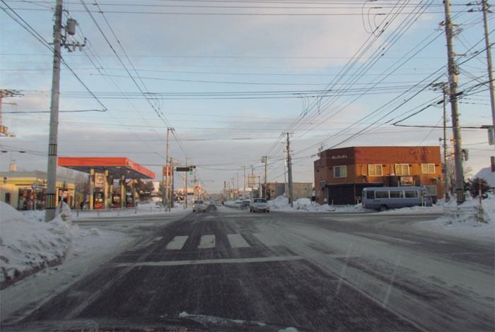 南岸通り、野付牛自動車学校前、奥がとん田通りの交差点