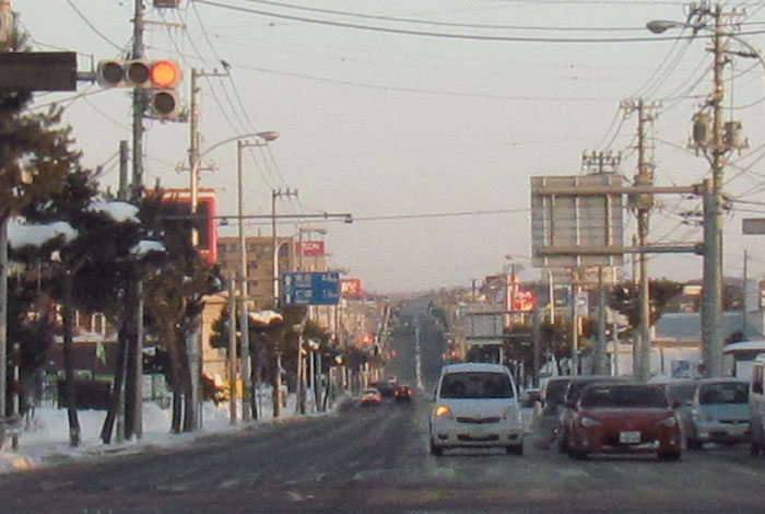 南岸通り、野付牛自動車学校前、奥がとん田通りの交差点