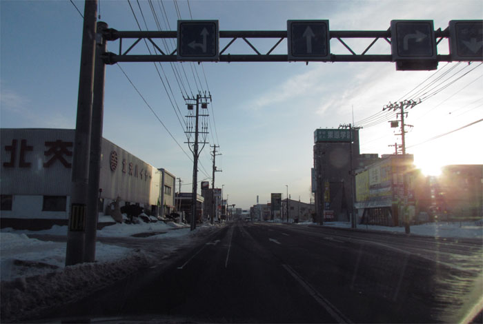 南岸通り、野付牛自動車学校前、奥がとん田通りの交差点