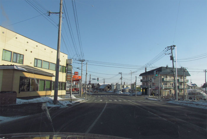 南岸通り、野付牛自動車学校前、奥がとん田通りの交差点