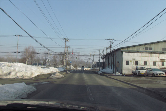 南岸通り、野付牛自動車学校前、奥がとん田通りの交差点