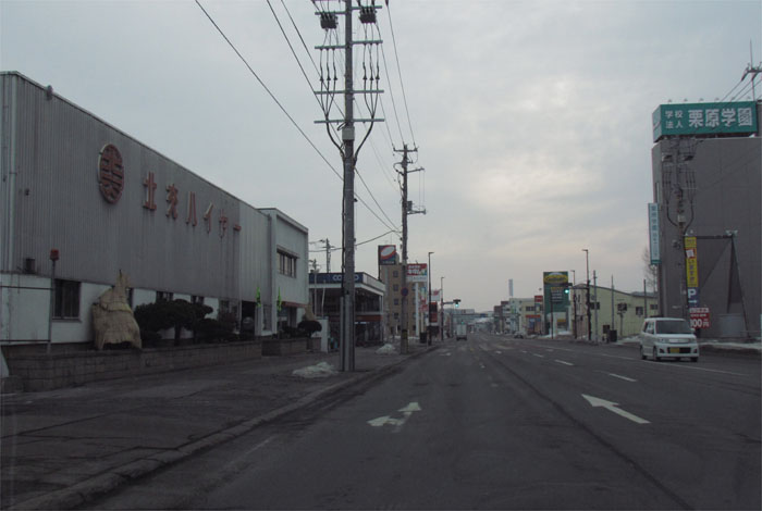 南岸通り、野付牛自動車学校前、奥がとん田通りの交差点