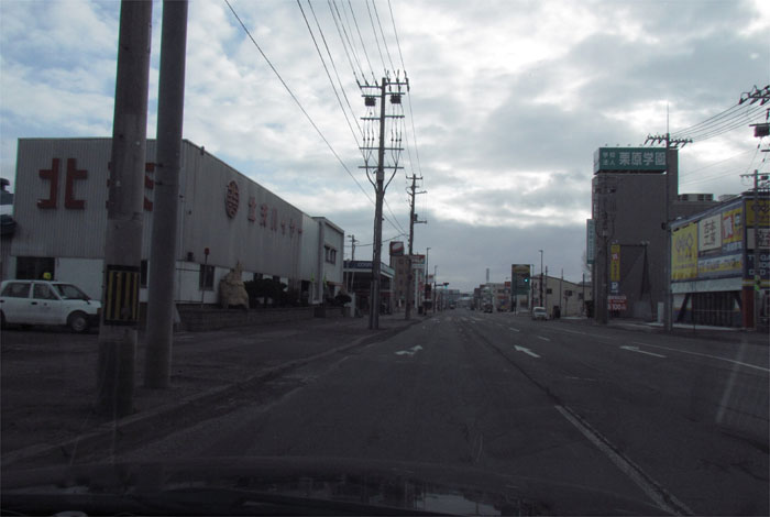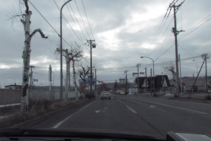 南岸通り、野付牛自動車学校前、奥がとん田通りの交差点