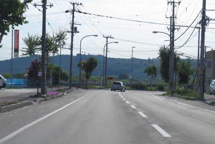 南岸通り、野付牛自動車学校前、奥がとん田通りの交差点