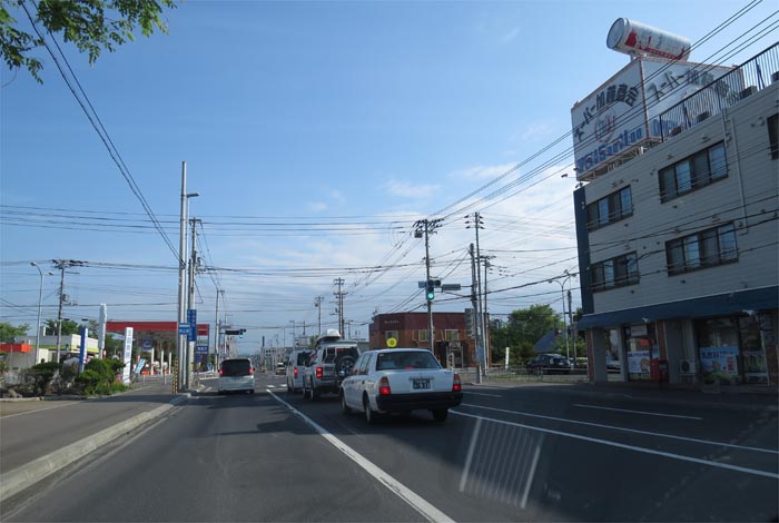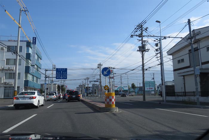 南岸通り、野付牛自動車学校前、奥がとん田通りの交差点