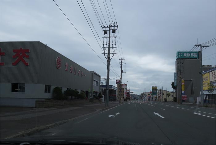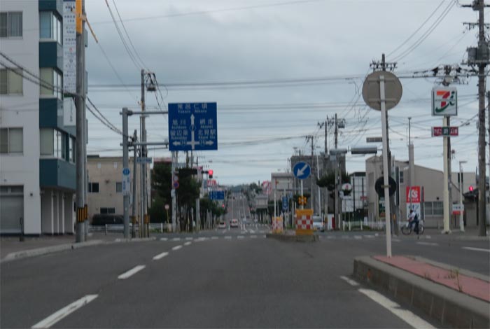 南岸通り、野付牛自動車学校前、奥がとん田通りの交差点