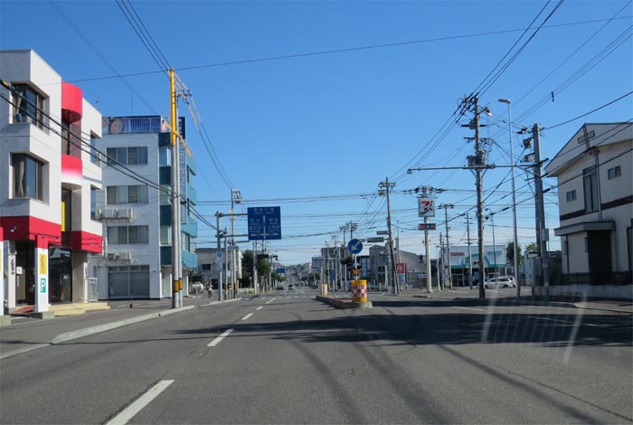 南岸通り、野付牛自動車学校前、奥がとん田通りの交差点
