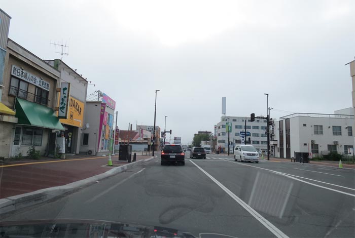 南岸通り、野付牛自動車学校前、奥がとん田通りの交差点
