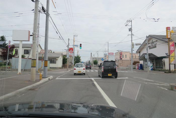 南岸通り、野付牛自動車学校前、奥がとん田通りの交差点