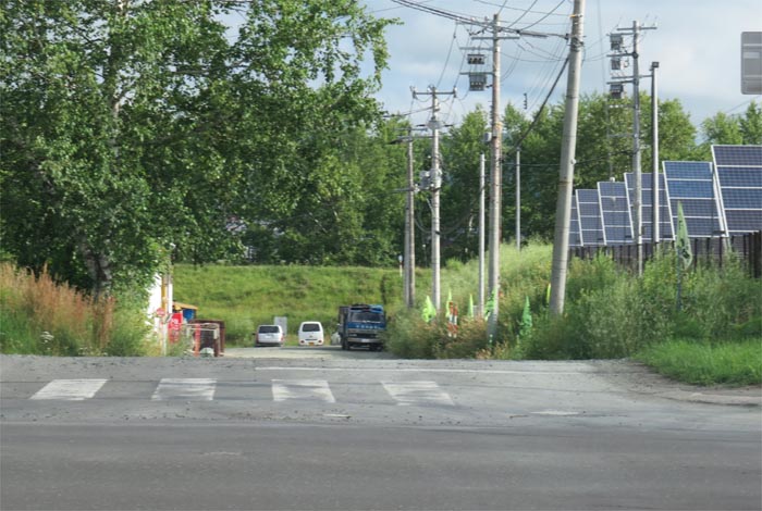 南岸通り、野付牛自動車学校前、奥がとん田通りの交差点