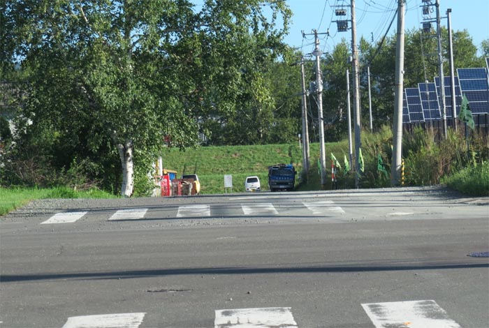 交差点から奥が無加川の右岸堤防で写真奥が国道39号方向