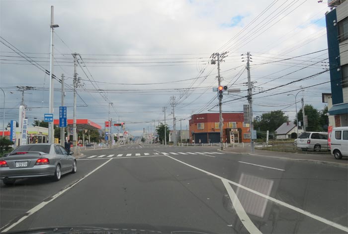 南岸通り、野付牛自動車学校前、奥がとん田通りの交差点