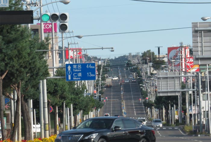 南岸通り、野付牛自動車学校前、奥がとん田通りの交差点