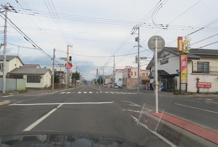 南岸通り、野付牛自動車学校前、奥がとん田通りの交差点